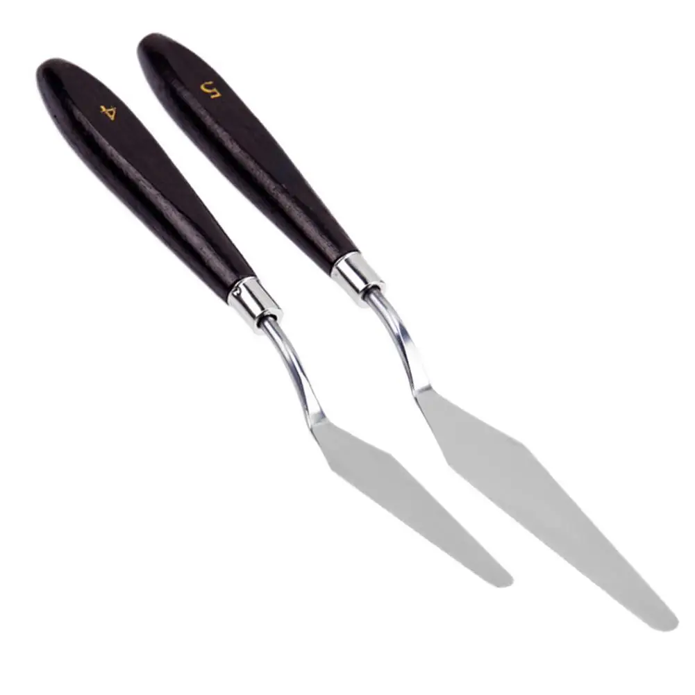 A set of 5pcs palette knives Great for working with oil paints on canvas or palette Spread paint quickly and evenly With extremely flexible steel blade and no sharpened edge They are used for mixing paint colors and paste, or for marbling, decorative details, etc With wooden handles, light and easy to grab Wooden Handle Size: Approx. 10*1.7cm / 3.9*0.67inch (L*W) Blade Length: Approx. 3.6-9cm / 1.4-3.5inch Material: Stainless steel (blade) and wooden (handle) Handle Color: Reddish brown ![]()