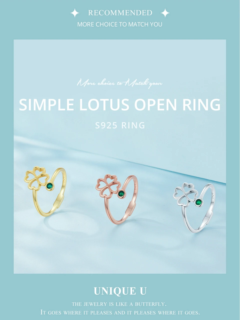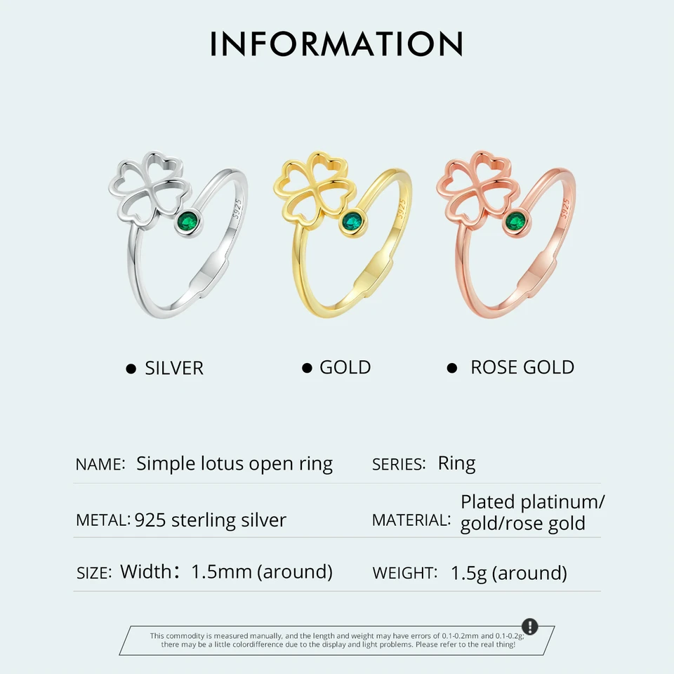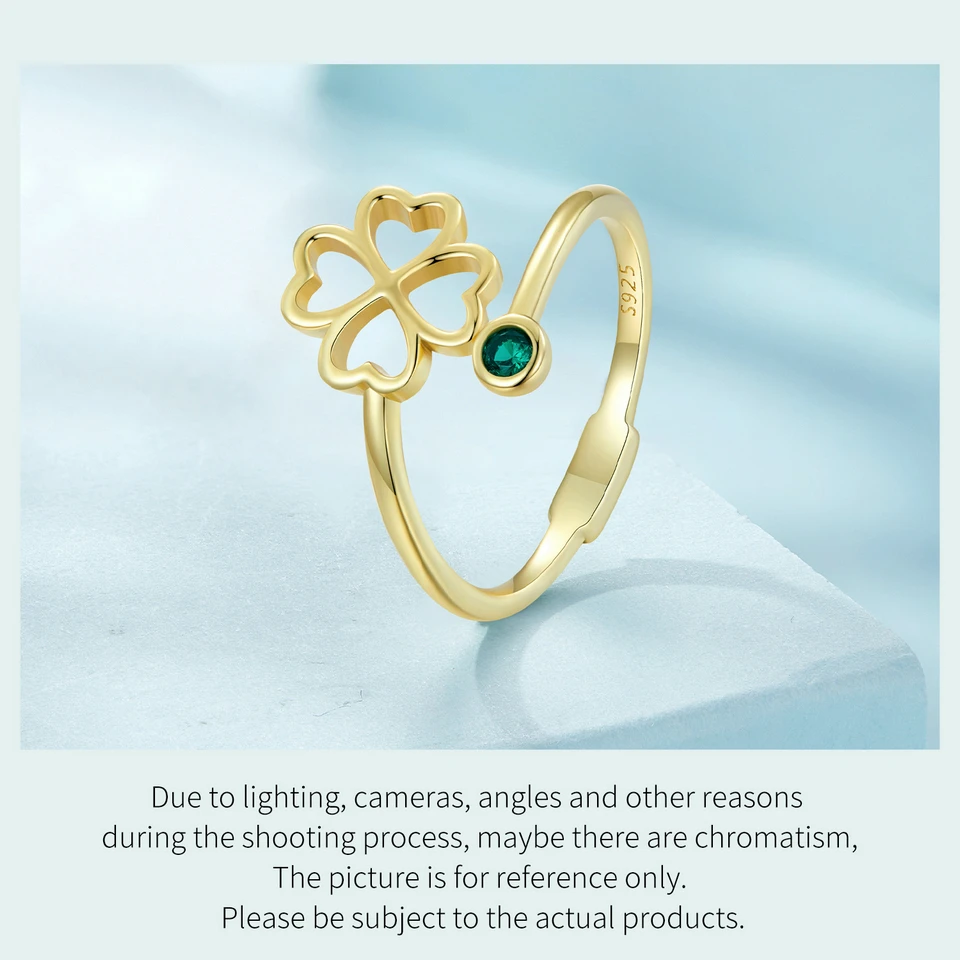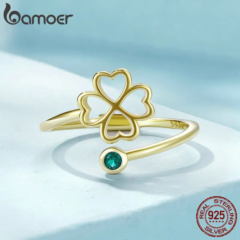 BAMOER 925 Sterling Silver Simple Four Leaf Clover Ring for Girl, Women 14K Gold Plated Promise Lucky Ring 3 Colors SCR843