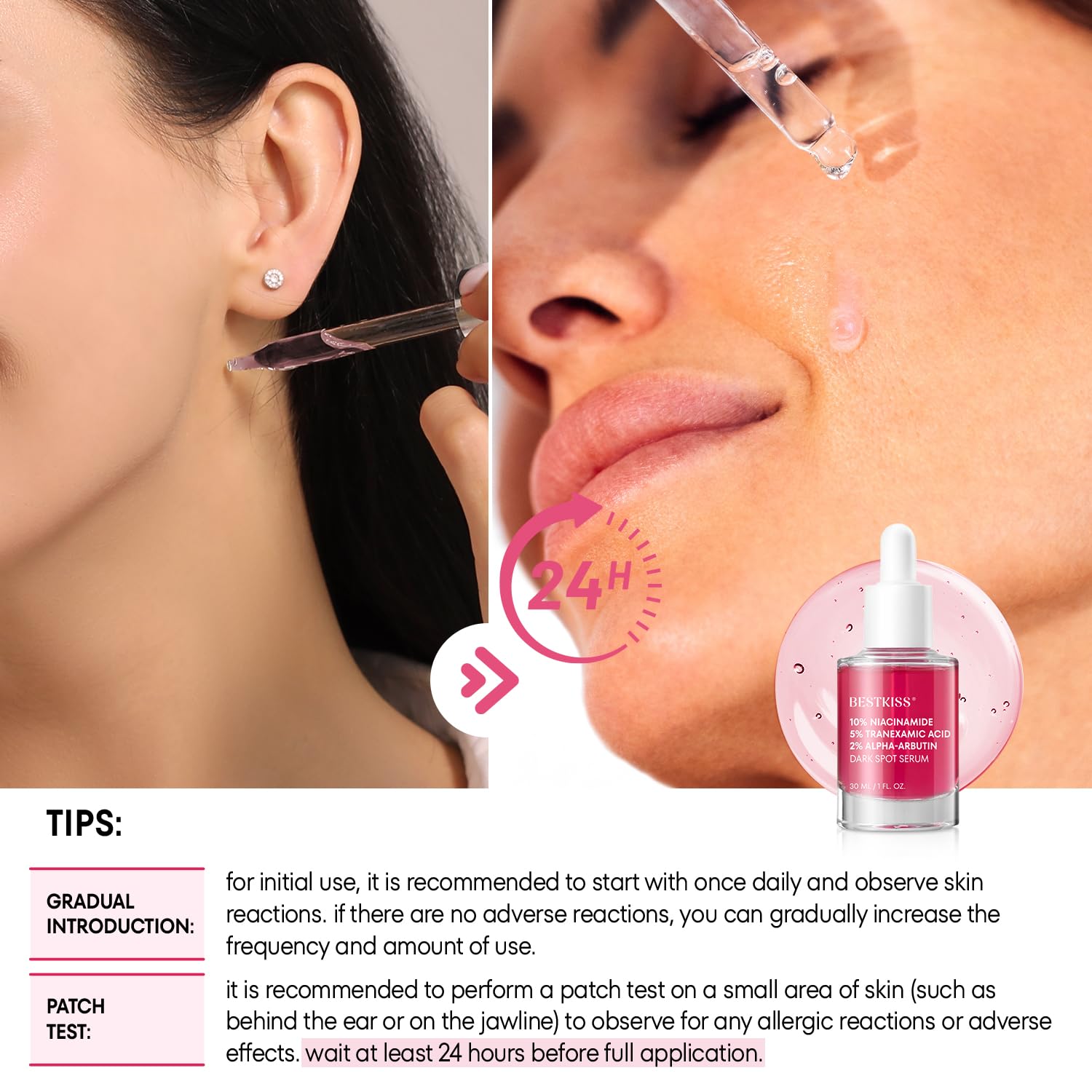 - Easy to Use: Apply a small amount of Bestkiss dark spot correcting serum to cleansed and toned skin. Gently massage in circular motions until fully absorbed. Use morning and night for best results. Follow with your favorite moisturizer and sunscreen during the day. Our niacinamide serum is Frangrance Free, Cruelty Free/Vegan, Phthalate Free, Artificial Color Free, Paraben Free, Gluten Free, Sulfate Free and Alcohol Free. Free from harsh chemicals, our face serum is suitable for all skin types, including sensitive skin, ensuring a healthy, radiant complexion without irritation.