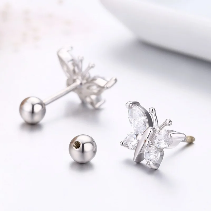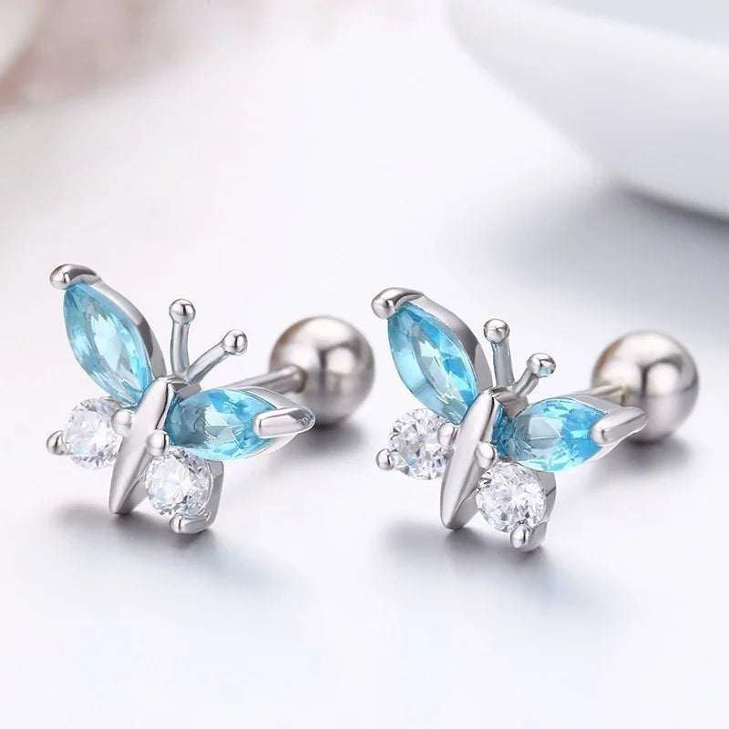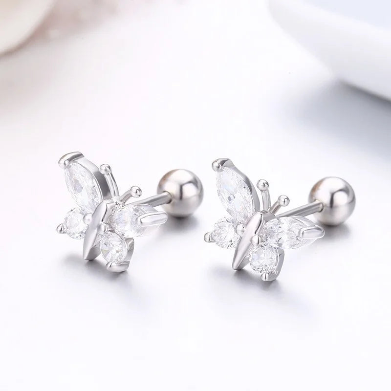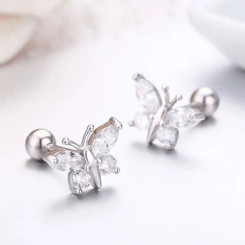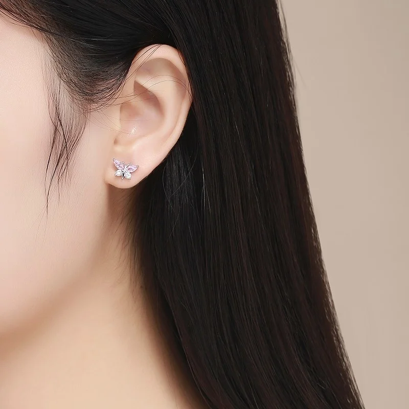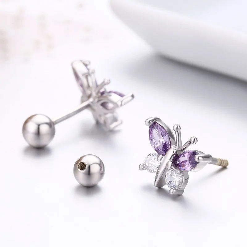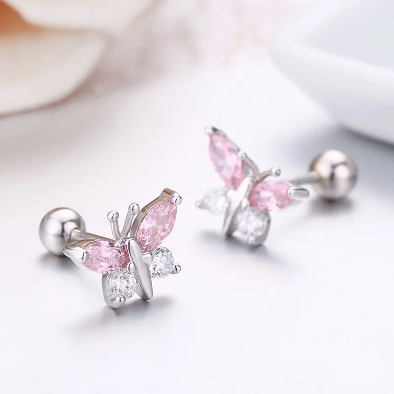 Cute 925 Sterling Silver Butterfly Pink CZ Screw Back Stud Earrings For Women Child Girls Kids Jewellery Orecchini Aros Aretes