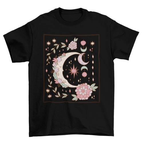 T-shirt design featuring a crescent moon with flowers and ornament details.