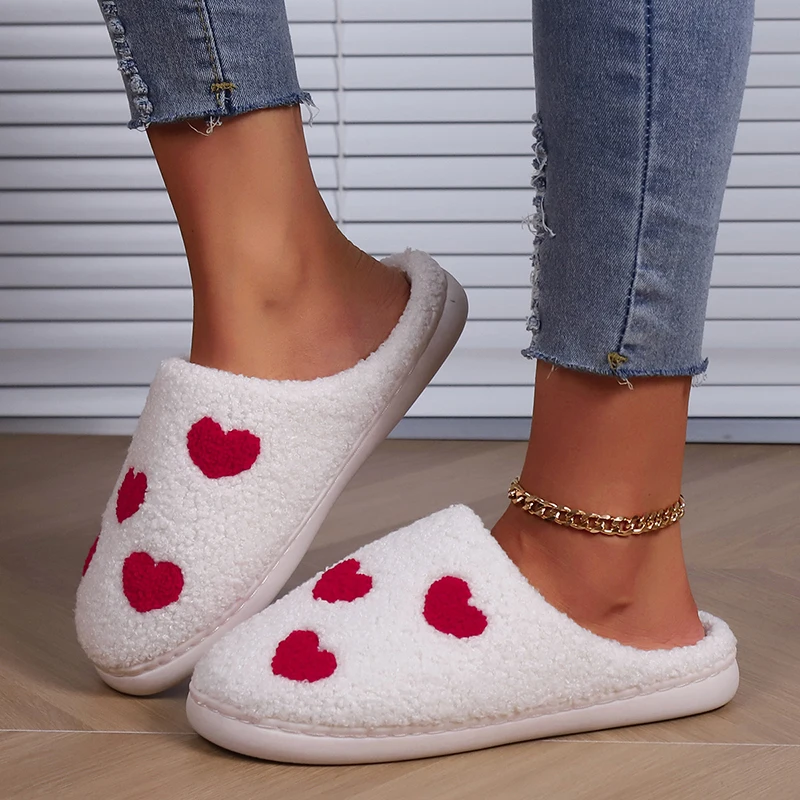 Lucyever Women's Warm Lambswool Slippers Heart Printed Plush Home Slippers Shoes for Women Non Slip Soft Bottom Slides Ladies