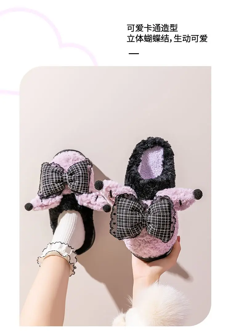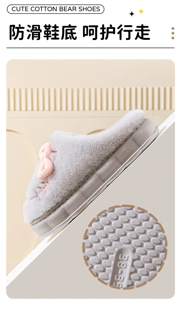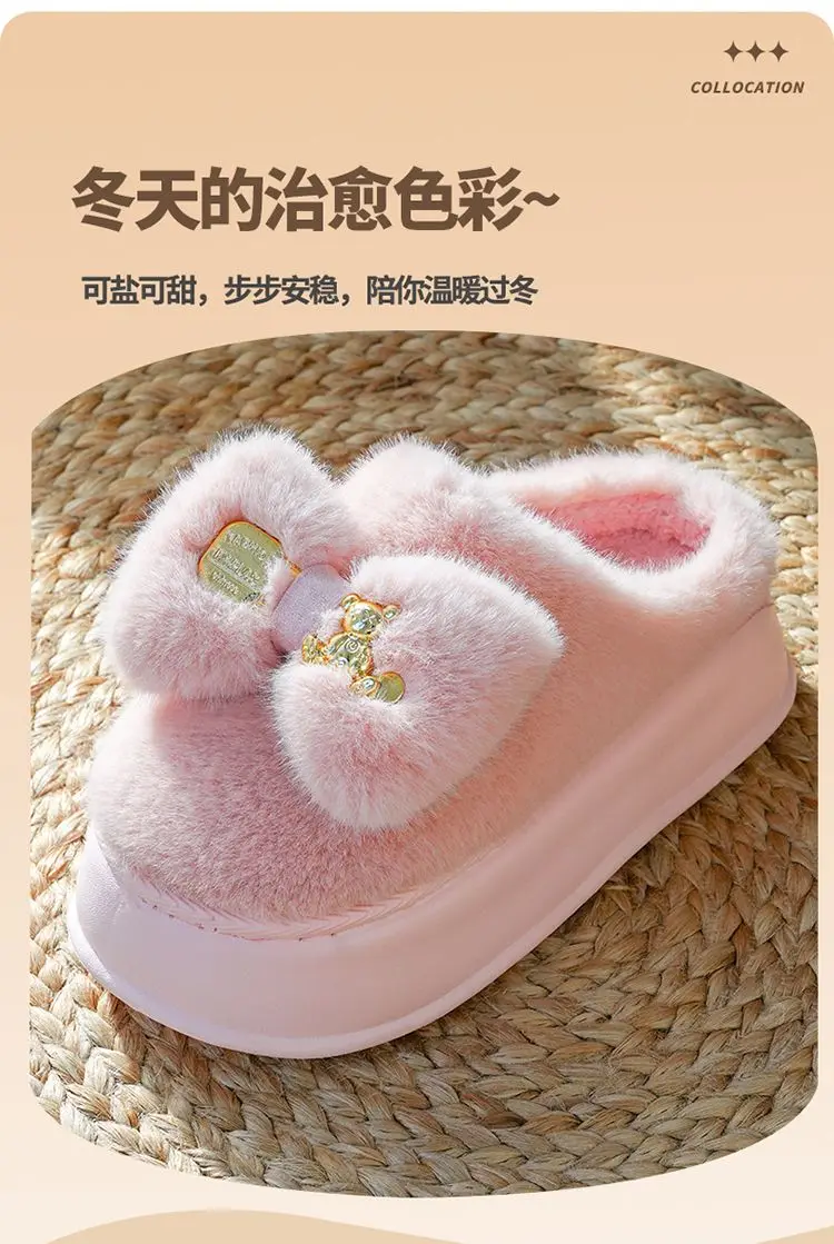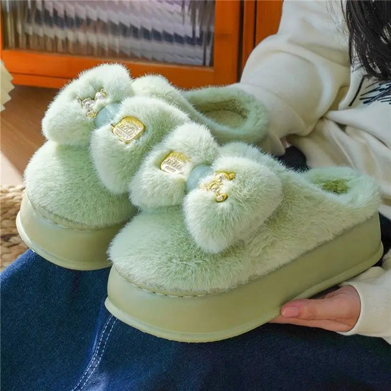 New green bow slippers winter women's 2024 shoes thick sole fuzzy slippers for home mules shoes woman fluffy metal house slipper