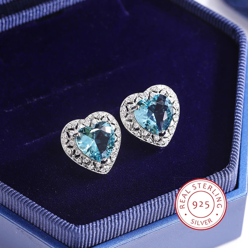 Stylish 925 Silver Plated Earrings for Women Beautiful Heart Shape Women's Shiny AAAA Women's Blue Zircon Korean Earrings