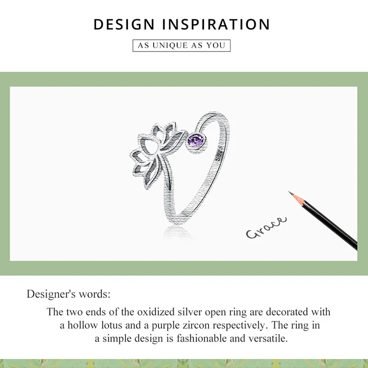 The two ends of the oxidized silver open ring are decorated with a hollow lotus and a purple zircon respectively.